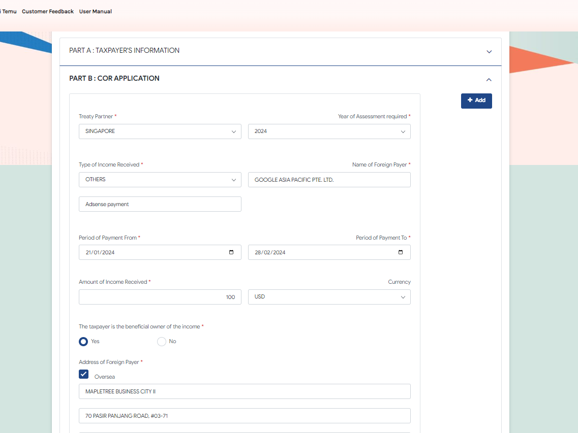 Why? Because Malaysia and Singapore are treaty partners. This is to help you avoid double taxation on your AdSense income. The application is FREE, however the COR is only valid for 12 months so you will have to reapply the following year.