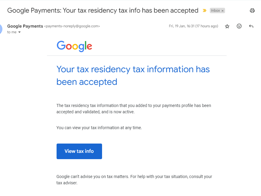 Then submit and wait for them to review your tax info (3 – 5 business days). Mine took around 9 days in total (including weekends). Submitted on 10th Jan and accepted on 19th Jan.