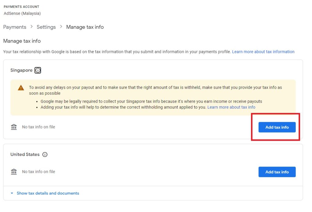 So I finally hit the USD100 threshold to get paid by Google AdSense. I received an email from Google asking me to add my banking details but after doing so a red notice appeared asking me to key in my Singapore Tax Info.