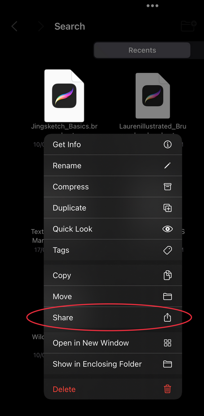Once you click download (on the ipad), if you don’t have the option to open in Procreate.. just save it to your files. From files, long press on the name.brushset and click share.